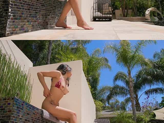 A neighbor saw asian masturbating by the pool and decided to help her