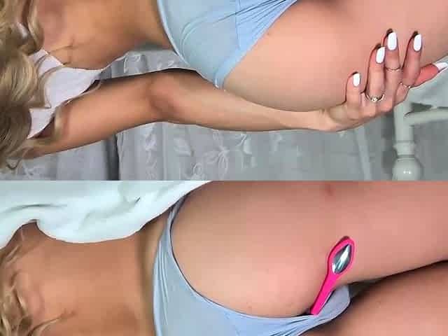 Horny White Girl Cums From Dildo in Pink Bikini
