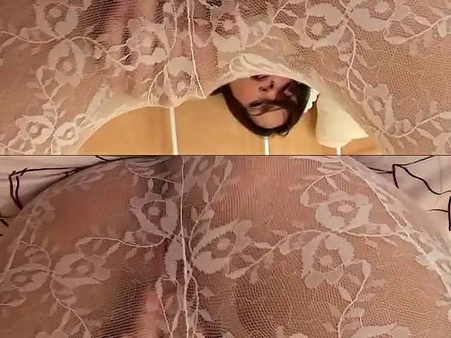 Slutty solo webcam model in crotchless fishnet stockings masturbating