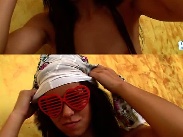 Sweet brunette chick Amira rubs ehr pussy through tights
