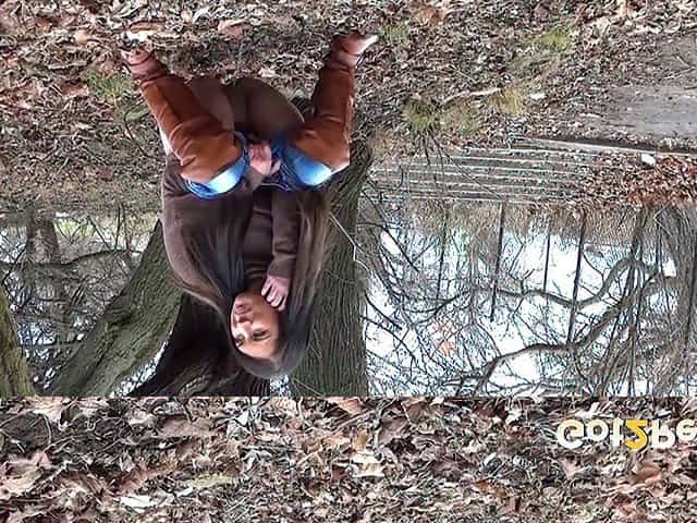 Kinky long haired brunette gal pulls down jeans and pisses outdoors