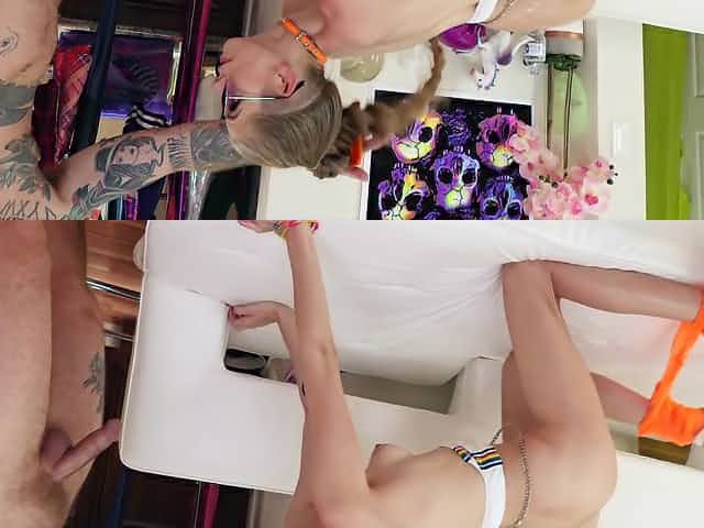 Skinny teen in shades shows cocksucking skills before anal fuck