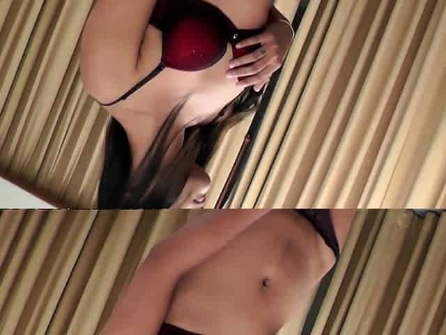 Busty Asian shemale in white panties masturbates solo in