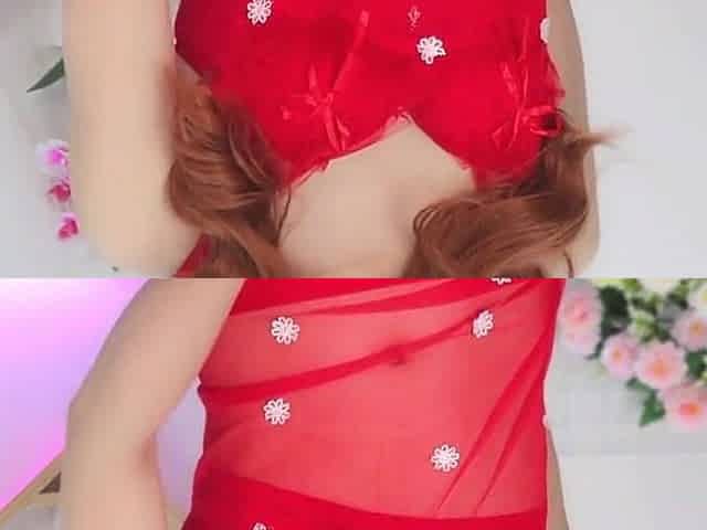 Teen ladyboy in red dress plays her long dick