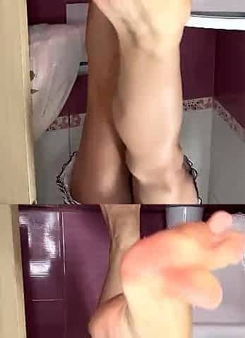 Brunette with foot fetish rubs big dick with her feet in POV