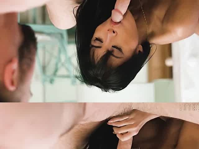 Hot brunette mia bangg gives pov blowjob before threesome