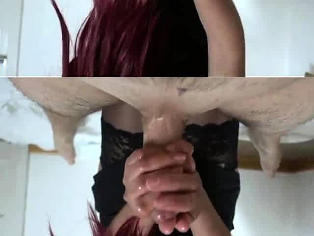 Asian slut drains cock on her tits