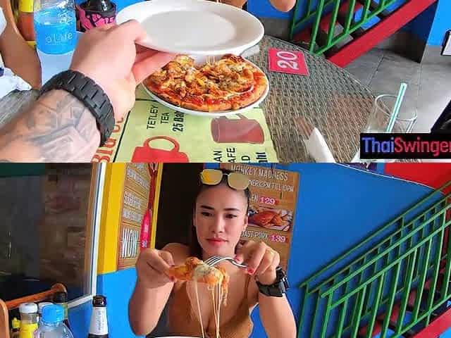 Eating pizza before filming a homemade sex tape with his busty Asian friend