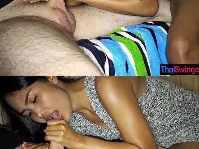 Cute Thai MILF girlfriend masturbates her pussy and jerks her boyfriends big cock
