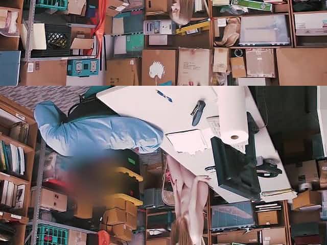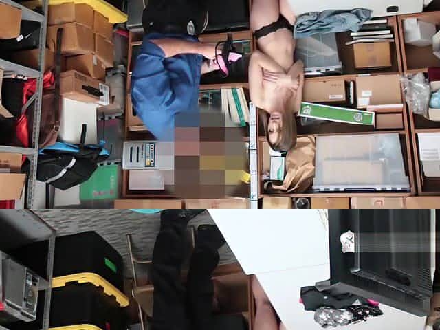 Teenage thief Naiomi Mae gives blowjob and gets pussy corrupted in storage room