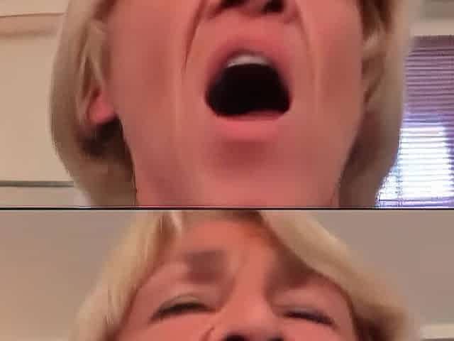 Skinny blonde granma swallows two cocks at once