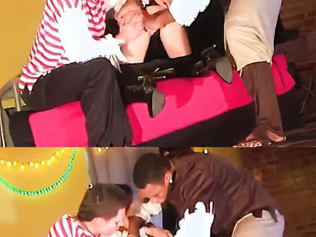 Crazy threesome in the middle of a dorm party.