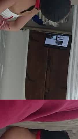Oral pleasure tied on a daybed, wearing platform boots and hose, watch my wife's pretty booty and legs