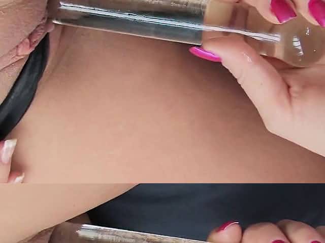 Stretching small twat and filling with semen