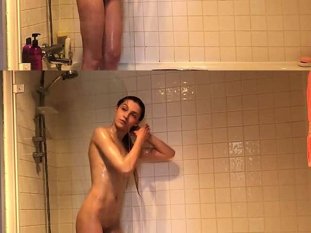 Spying on my stepsister - young blonde with big naturals & hairy pussy craves cumshot