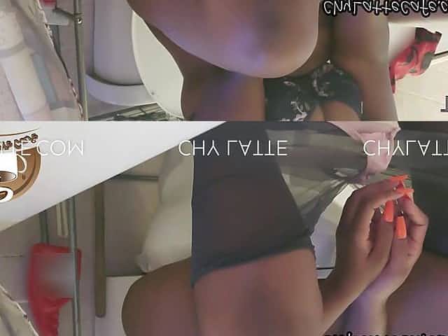 Sitting on toilet bowl lusty bitch spreads legs to work on wet pussy