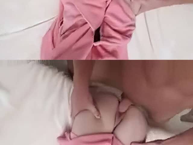 Lusty teen in pink top rides a long white cock on bed
