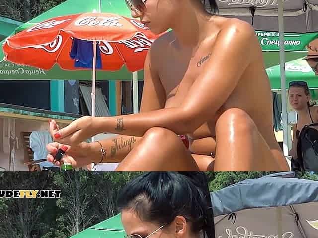 Topless Beach Babe Rubbing Lotion On Her Body