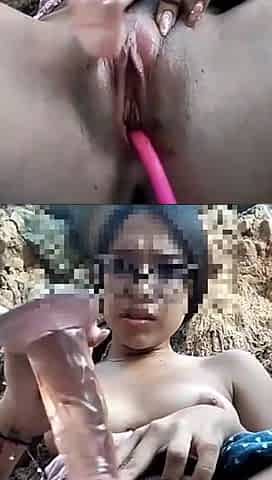 cute and hot Oriental gal touch herself in bench and people walking all around