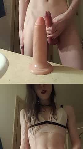 Sissy tranny plays with his cock and a big suction dildo