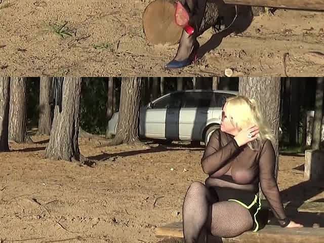 On the road in transparent hose bodysuit with pissing and fake titties