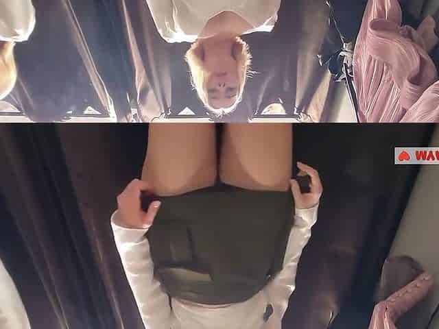 Trying on transparent clothes in the fitting room. Naked blonde flashed her boobs in a public place
