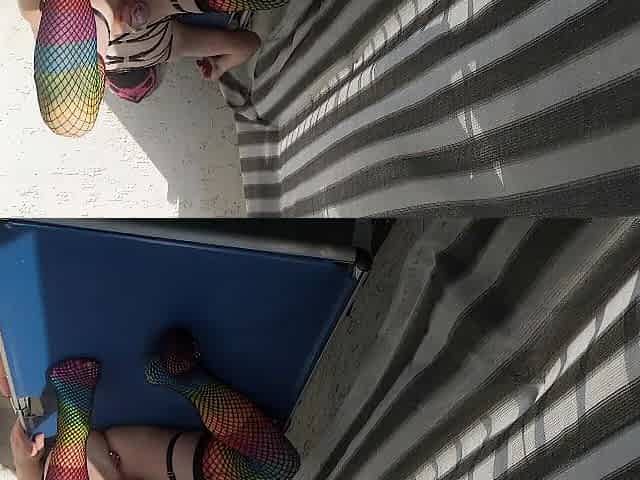Sissy Crossdresser on public porch outside with sex toy ridIng