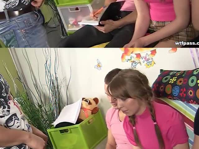 Hard gangbang makes the tight nymph pussy itch