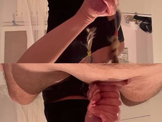 POV girlfriend jerking off dick in duo while in pyjamas