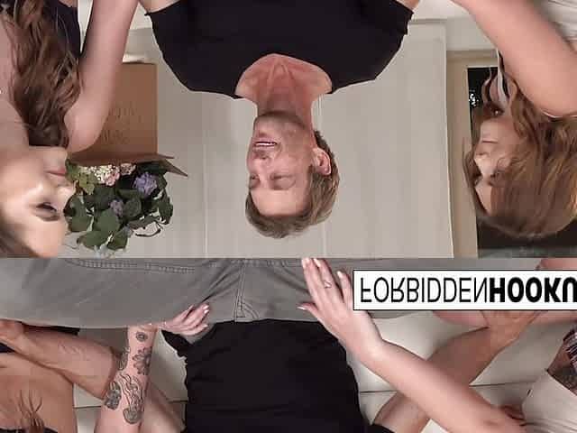 FFM twins, kiss every other, twat licking, double BJ & screw