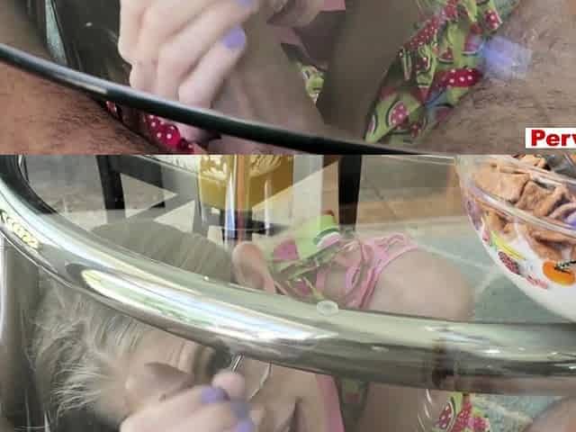 Milf sucking cock under the dining table caught by teen gf