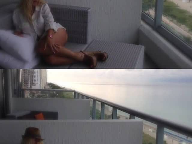 Sexy blonde MILF on vacation flashing her huge tits on the hotel balcony