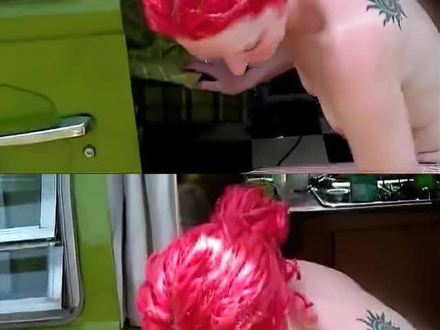 A girl is in a van that has a kitchen and she is fucking hard