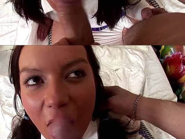 Busty French Lady Eating Warm Cum From a Thick Pecker