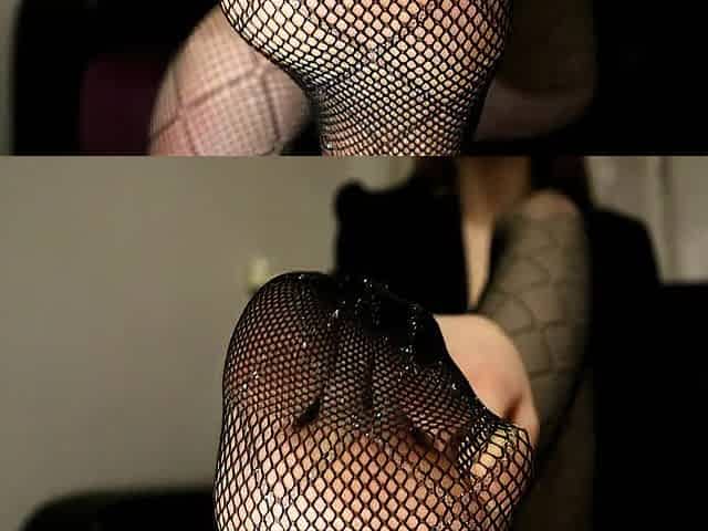 That babe put on beige nylons and jerks off a pink cunt