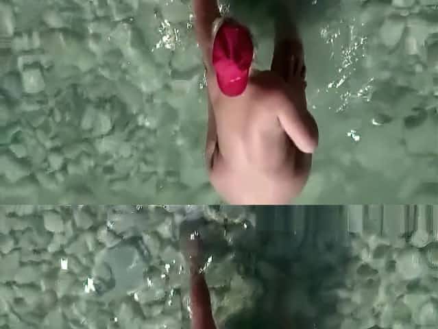 Nudist brunette swims in the water