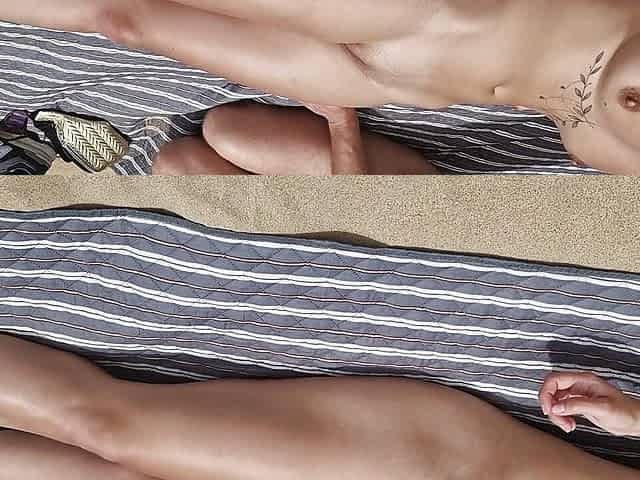 Couple of mutually masturbating to orgasm at a public beach