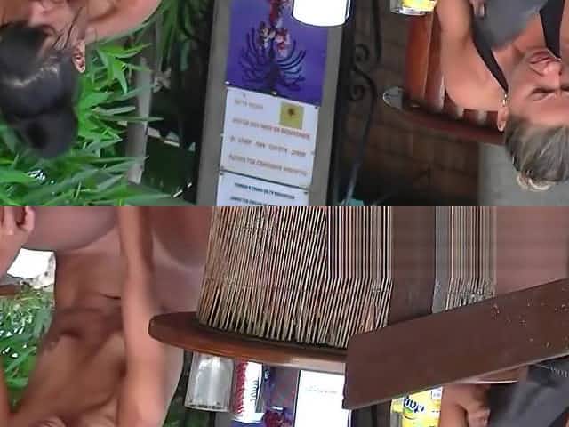 Naked cutie gangbanged in public bar