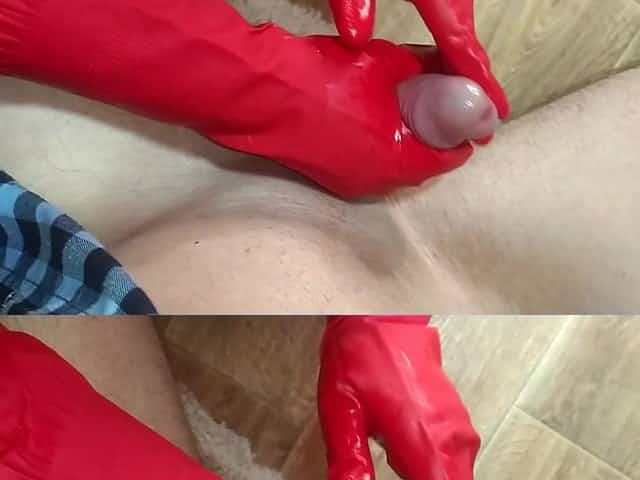 Cumming hard from my jerking off with rubber gloves POV