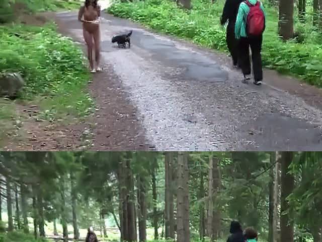 Naked brunette walking flag in public