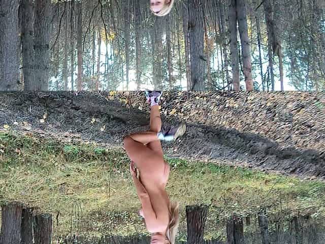 Public erotica, the girl walks through the woods and shows h