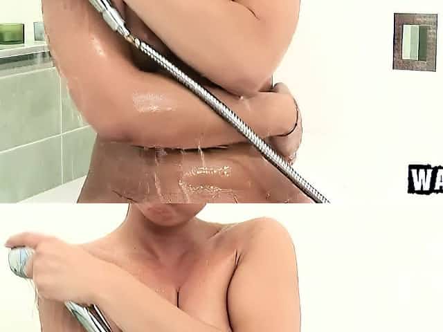 Hot blonde Milf Janet gives a show in the shower washing and playing