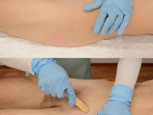 Depilation with film wax of the penis and eggs in the bikini area. Very hard
