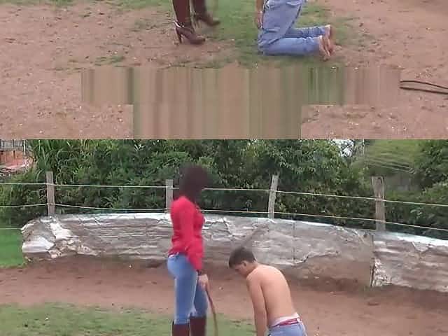 Femdom FM Whipping by riding woman in jeans