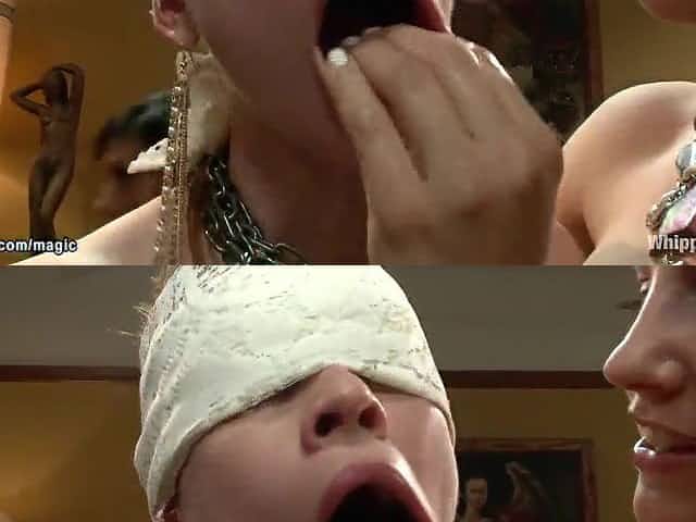 Two Dommes Whip, Tease, Shock, And Foot Gag Naked Male Slave