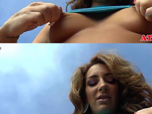 Lustful cutie is widening her legs wide open, on the balcony and playing with her juicy snatch