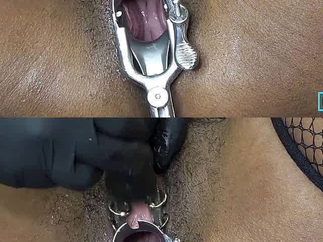 Dark Dea's wide open and wet pussy in a gyno-exam