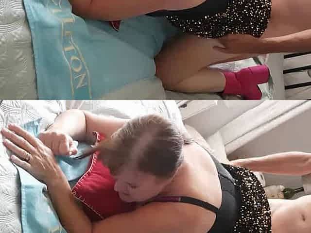 enculée en body résille sur le canapé