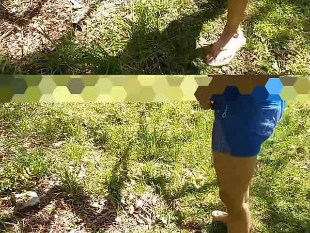Naked wife in sandals showing her feet in the front yard