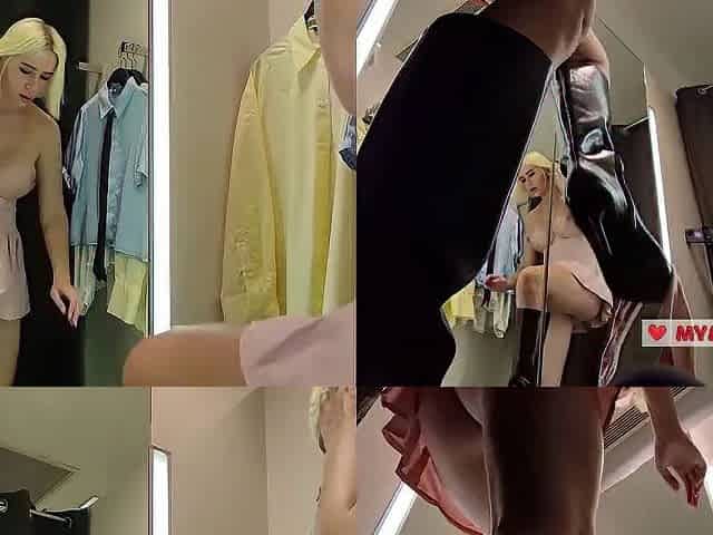 Young blonde with big tits tries on transparent clothes. Blonde MyCandyAlice shows tits in fitting room